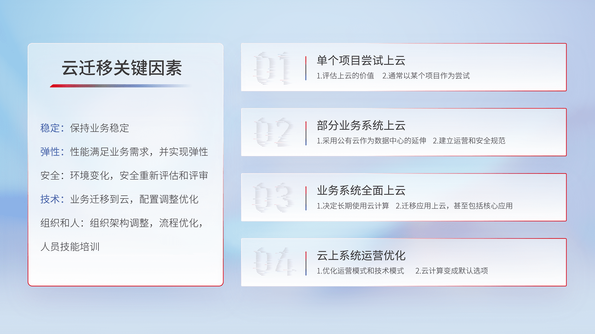 结合实际业务,,从规划设计、、、云平台选型、、云原生改造、、数据迁移、、集成交付,,,迁移全过程为客户识别最佳上云路径,,做好风险识别管理,,设计网络架构、、、身份权限、、安全审计合规、、、操作审计、、、、日志审计、、、、监控告警策略、、、、多站点容灾设计等,,对云上基础设施进行整体规划,,提升IT治理水平,,,,以满足弹性、、、、高可用、、、、高性能的需求。。。。