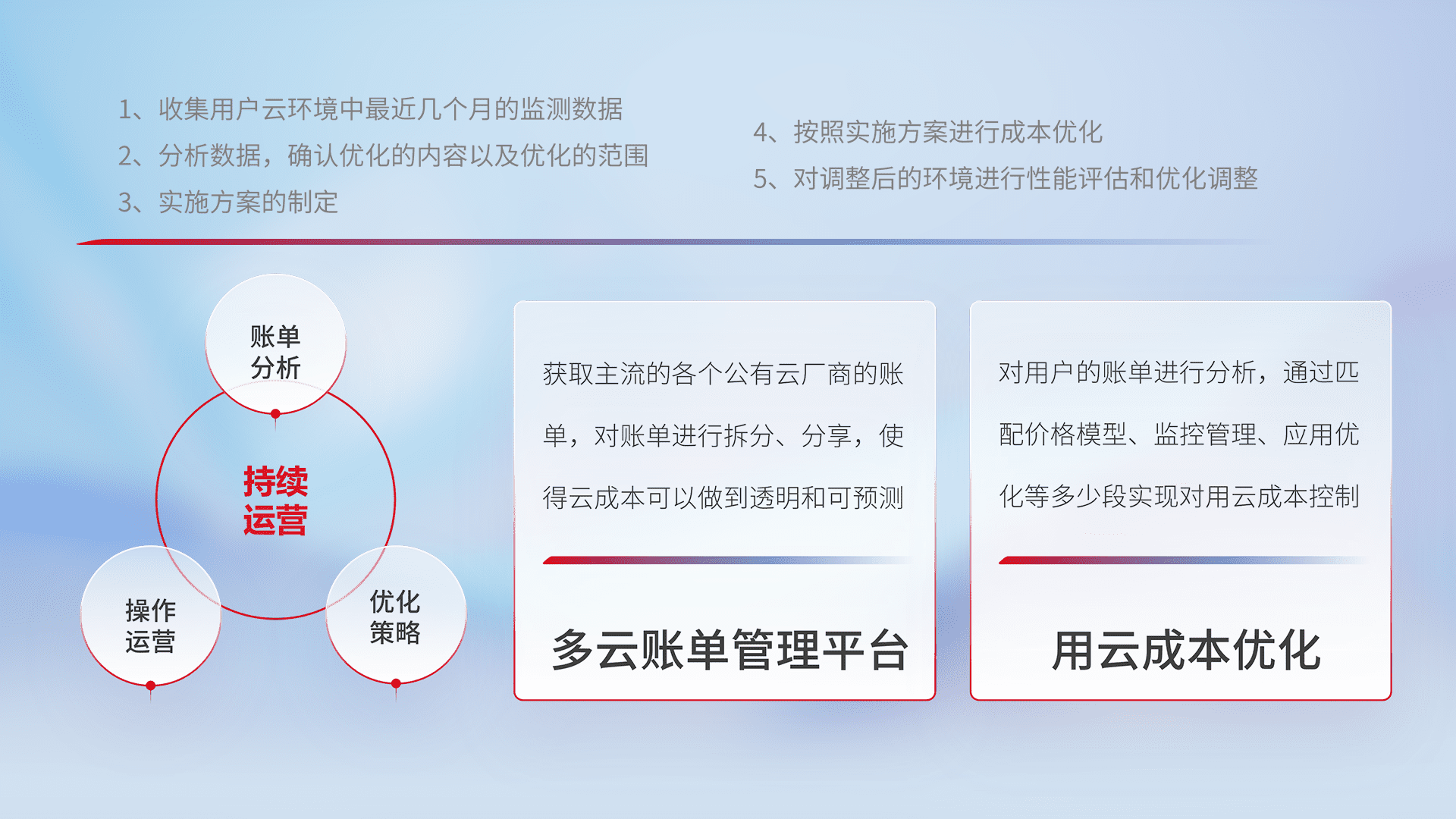 通过多云纳管,,,,以统一的资源数据模型把客户的云资源进行抽象和封装,,进而实现对多云资源的统一操作,,保障云资源管理的可靠性、、、稳定性与可用性。。量身定制化运维内容,,,配置、、开发运维、、、、补丁管理、、备份、、、监控、、、认证和访问管理、、、、审计和日常巡检等,,,,保障在用云过程中的可靠度,,,稳定度以及高可用率。。